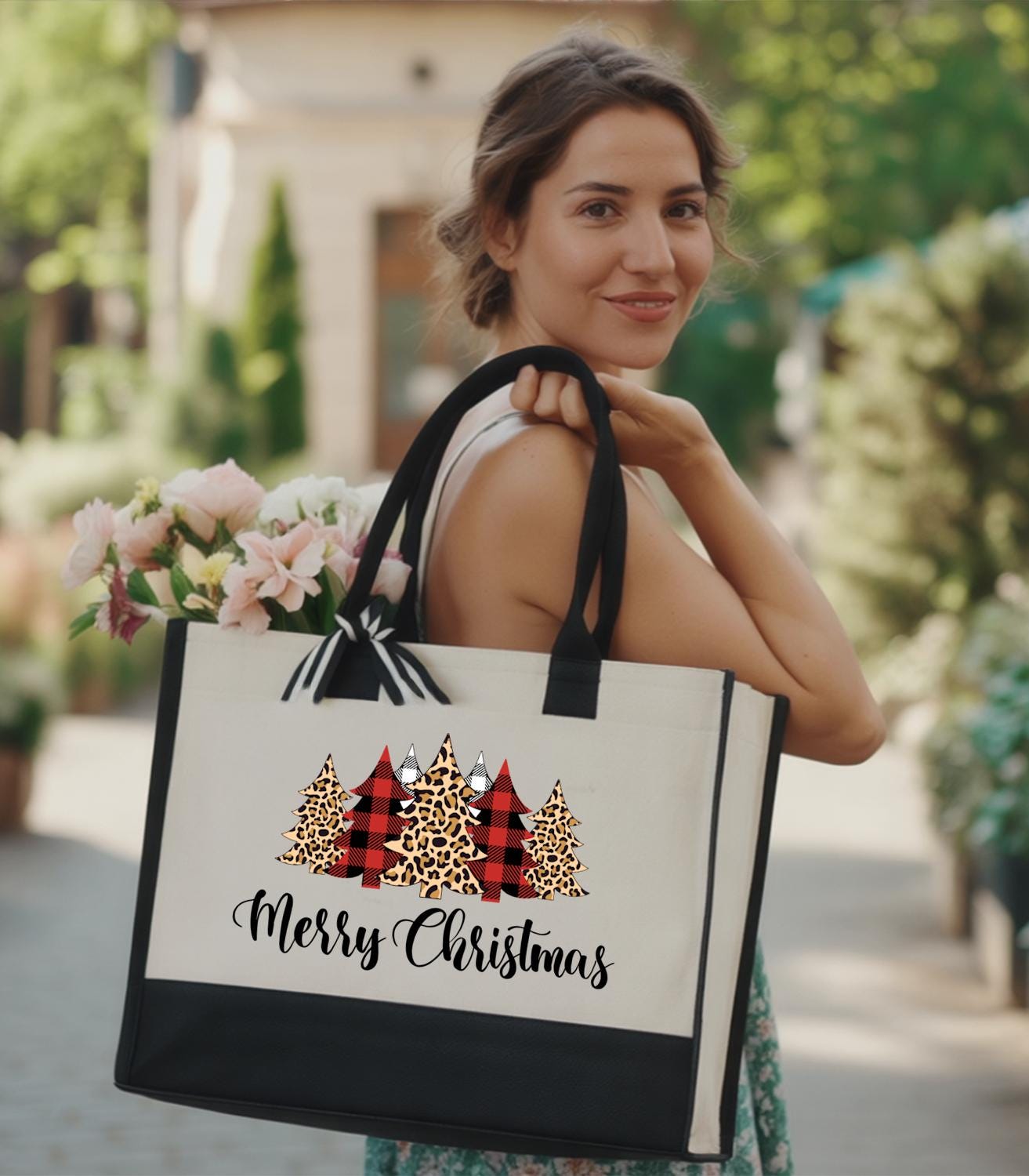 Christmas Tree Tote Bag, Buffalo Plaid & Leopard Print