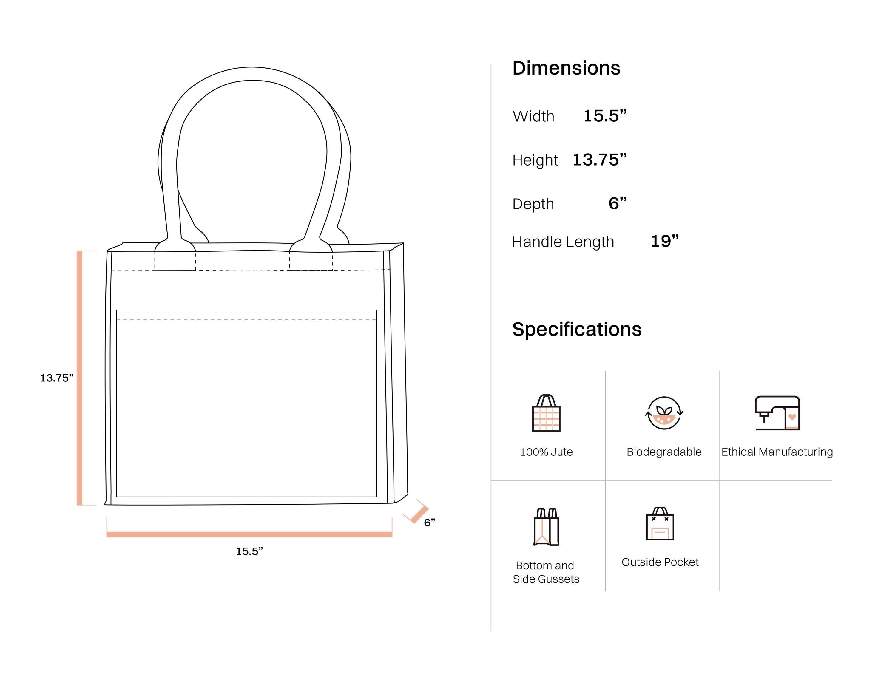 Tote Bag Measurements - 15.5"L x 13.75"H x 6"D