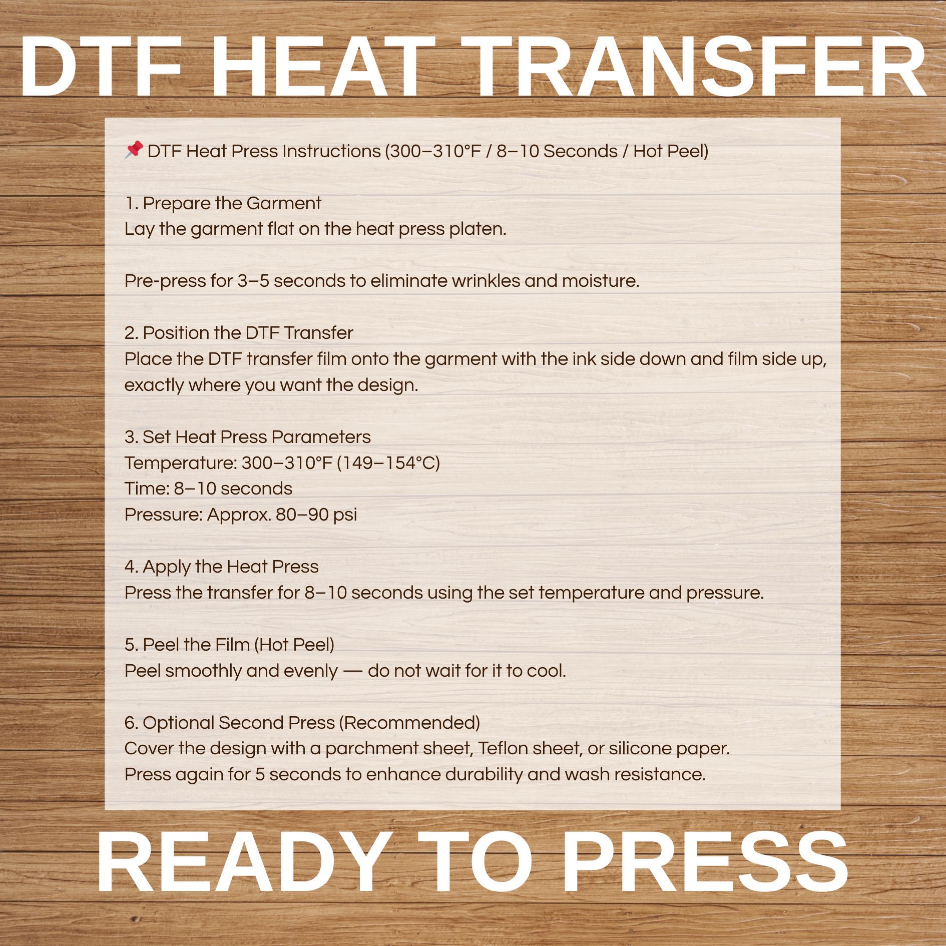 DTF Heat Press Instructions (300–310°F / 8–10 Seconds / Hot or Cold Peel)