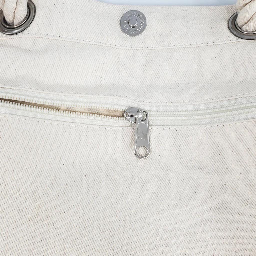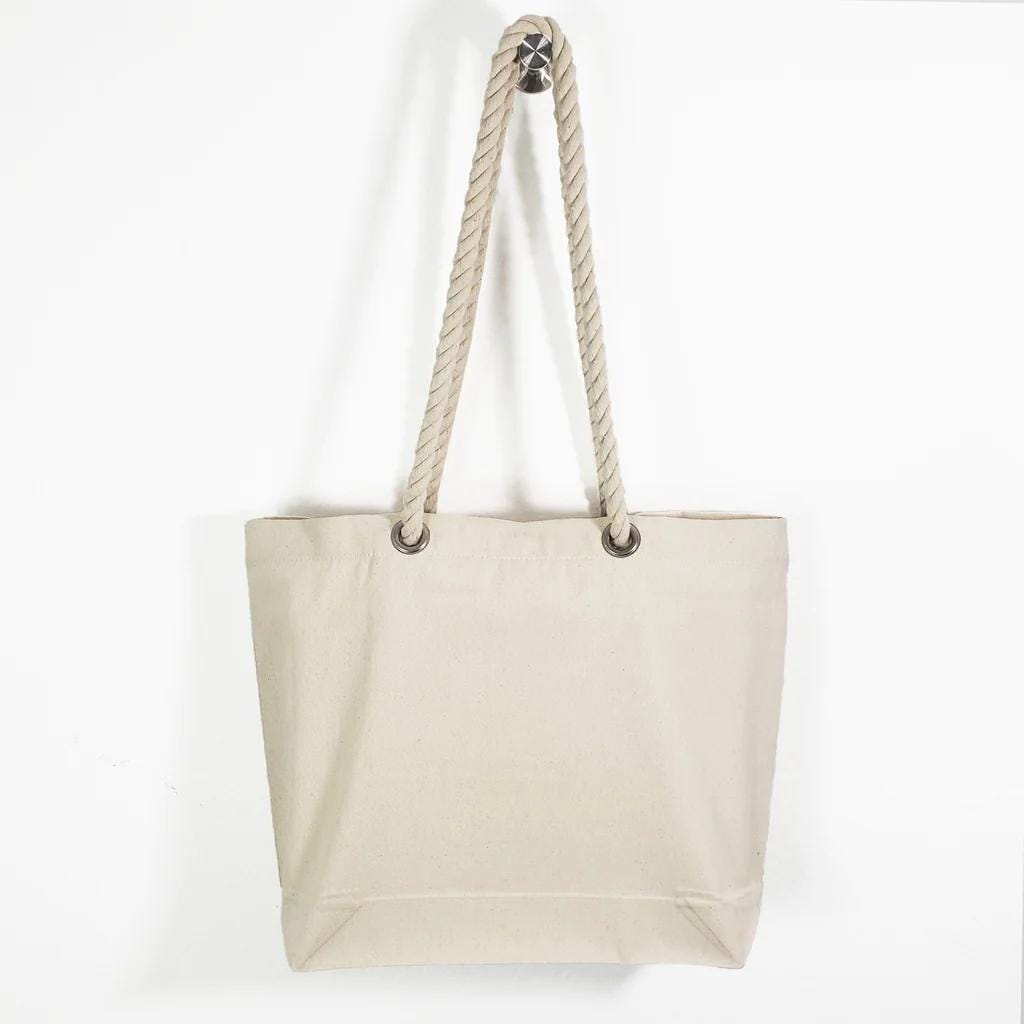100% cotton, 26" rope handles, inside zippered flap pouch pocket.