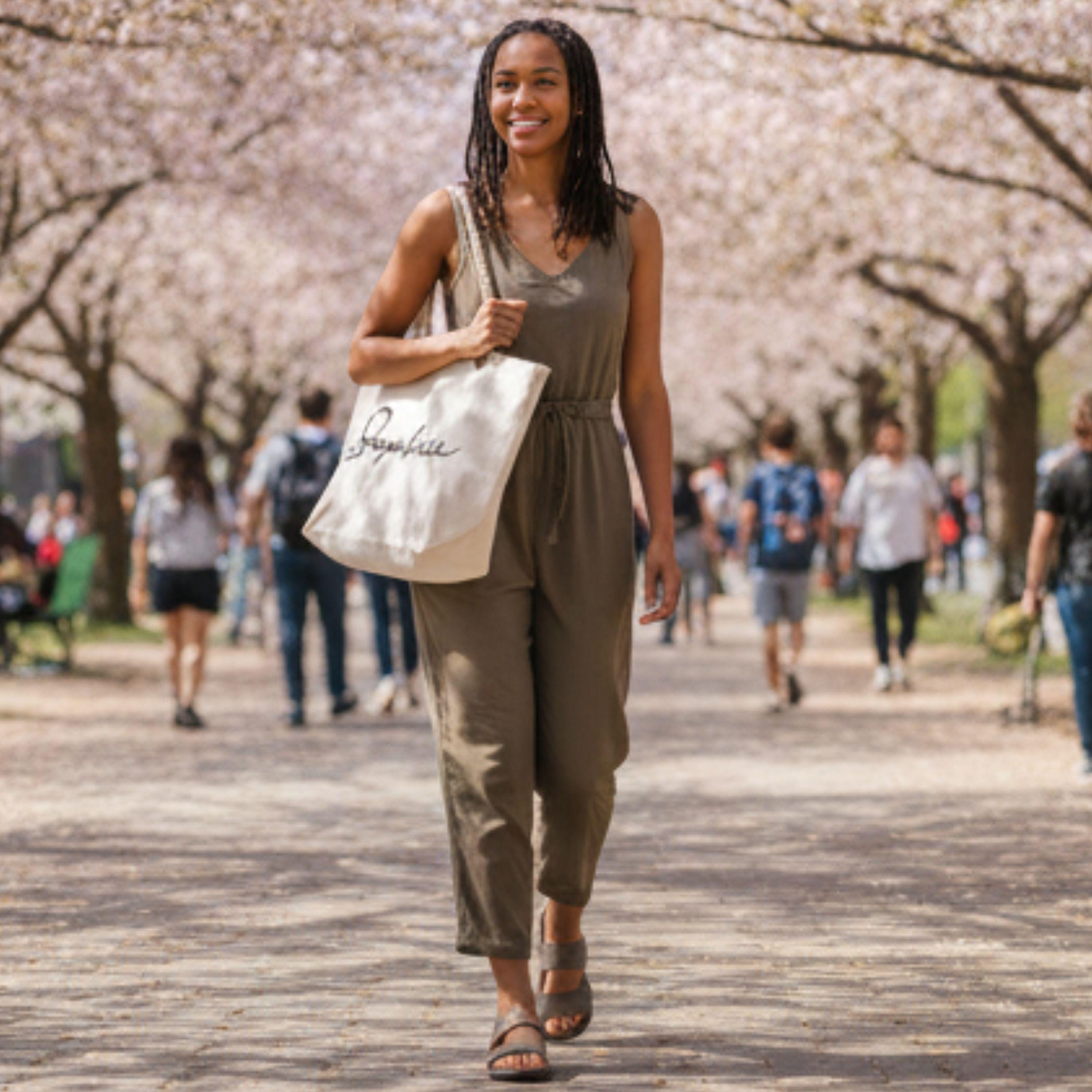 100% cotton, 26" rope handles, inside zippered flap pouch pocket.