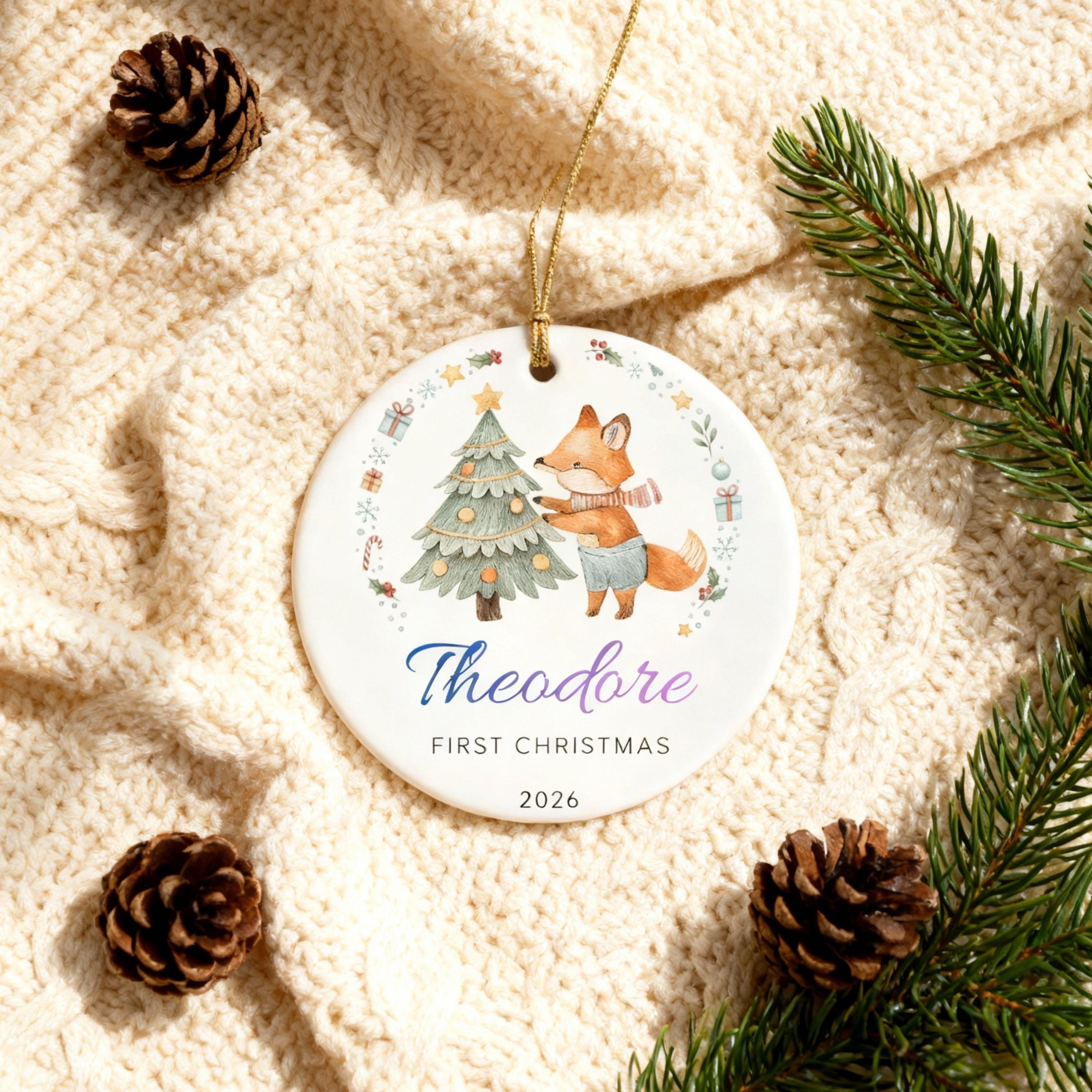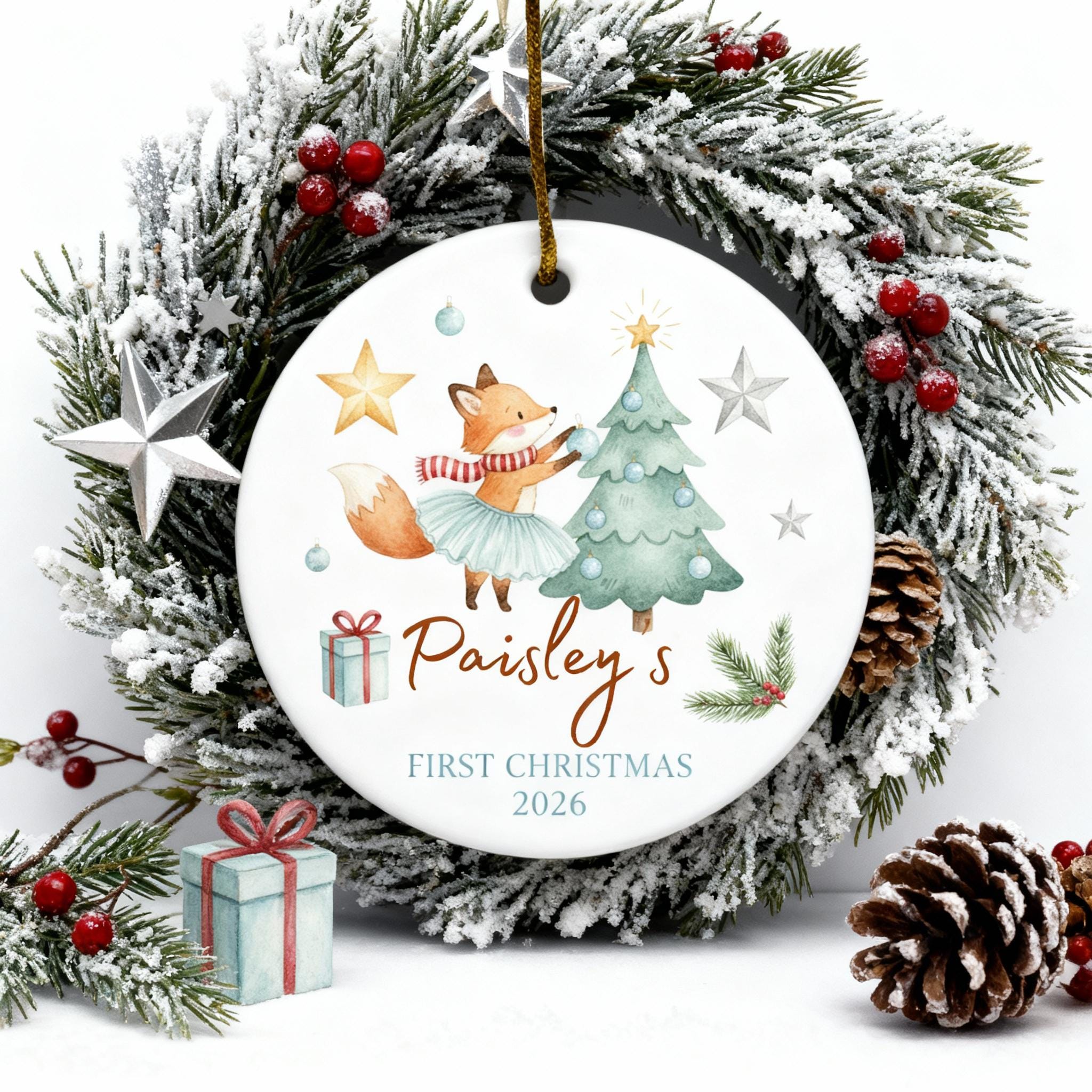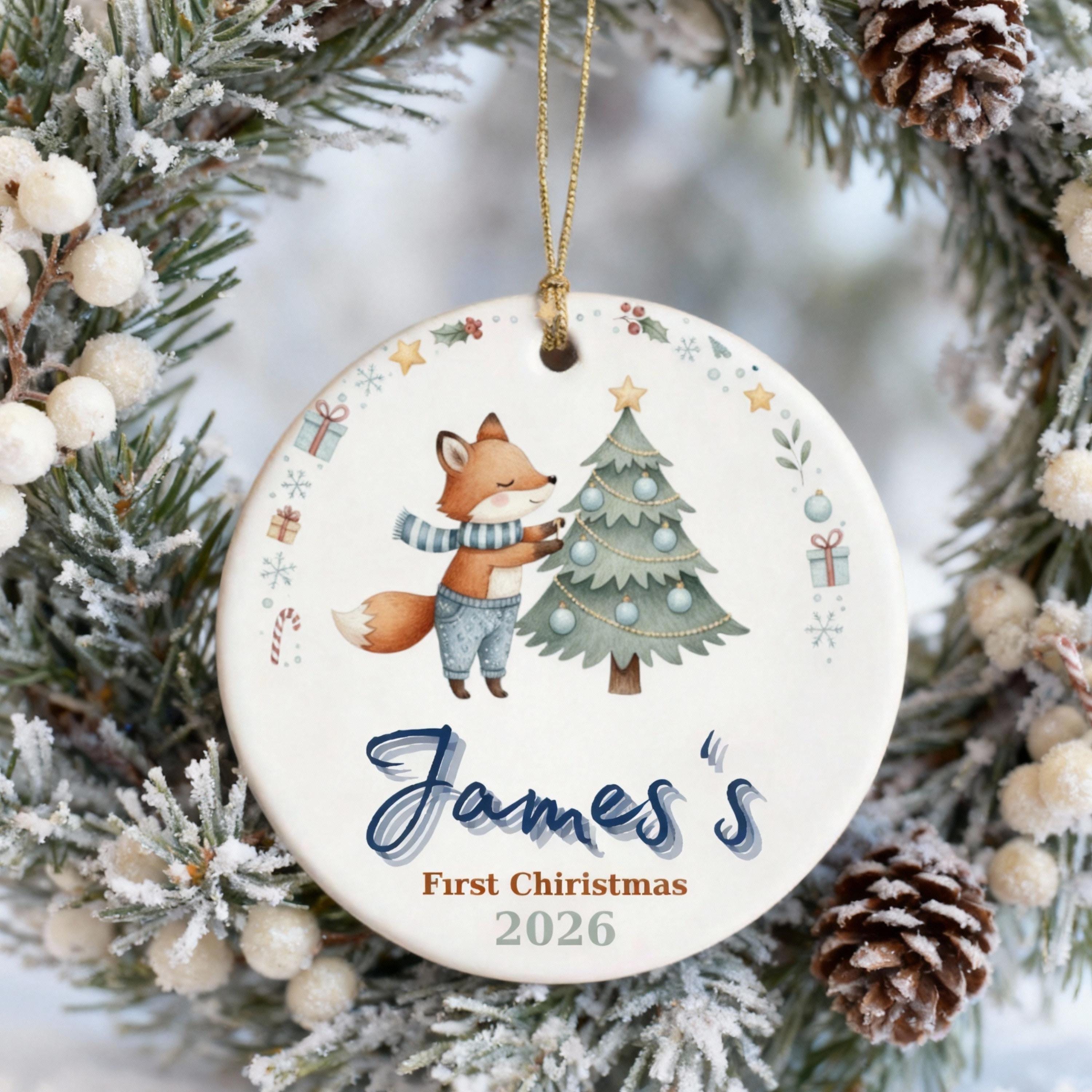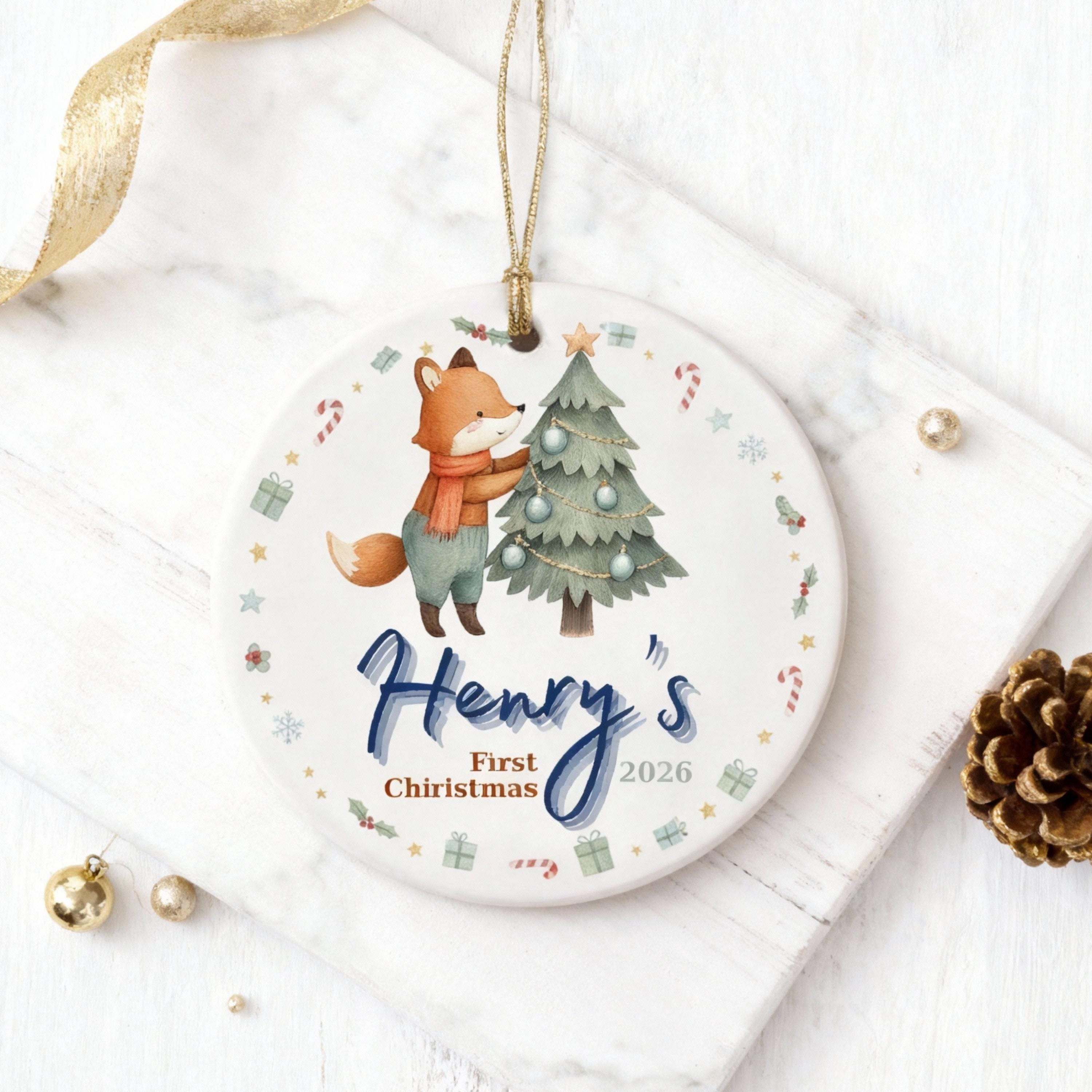 Personalized Baby's First Christmas Ornament, Fox Ceramic Bauble