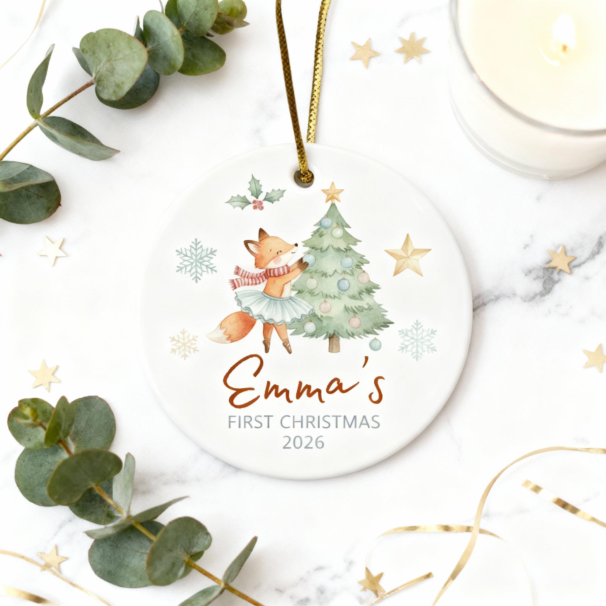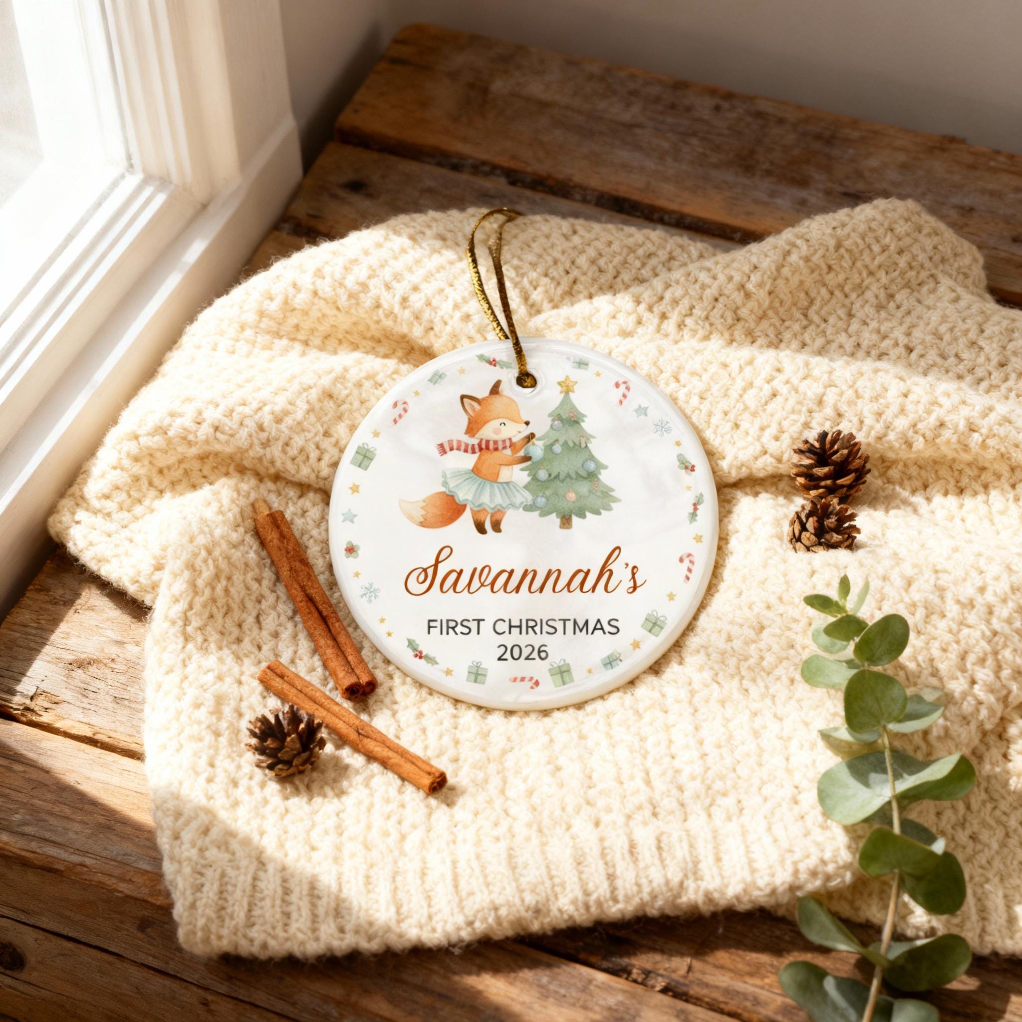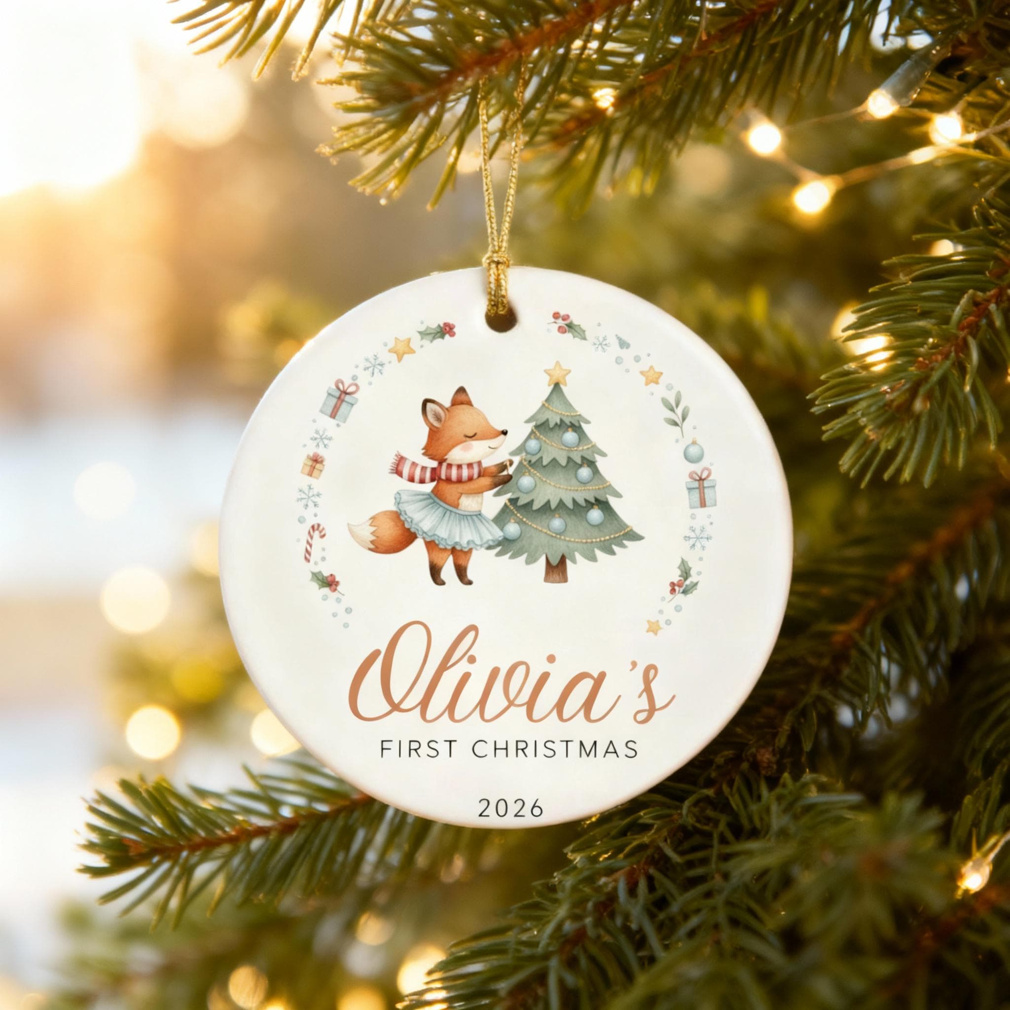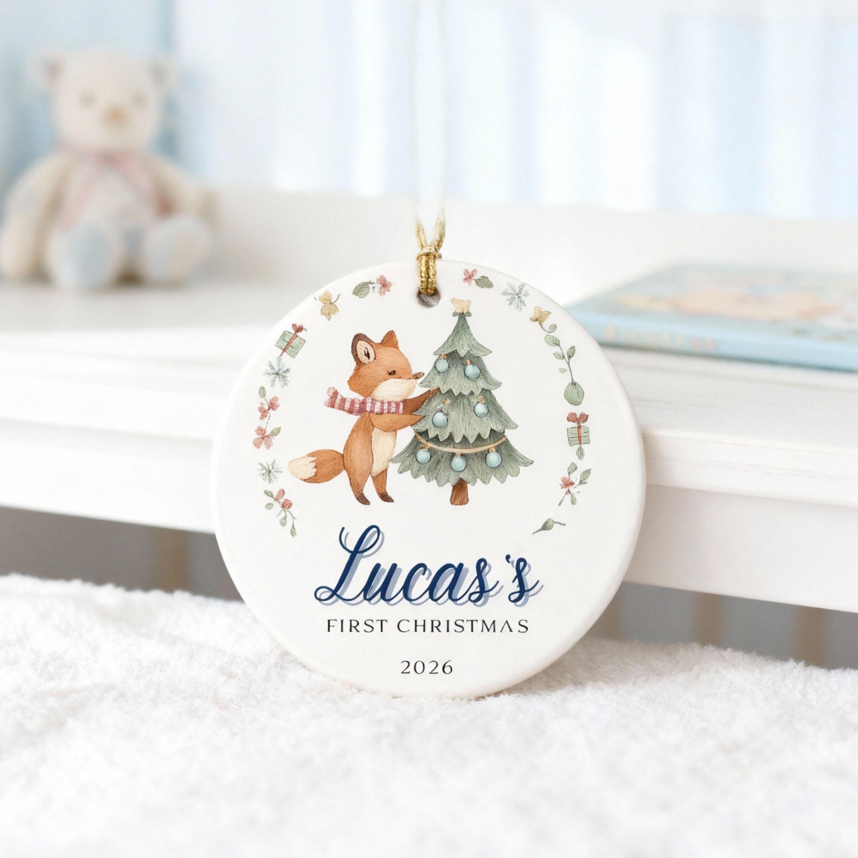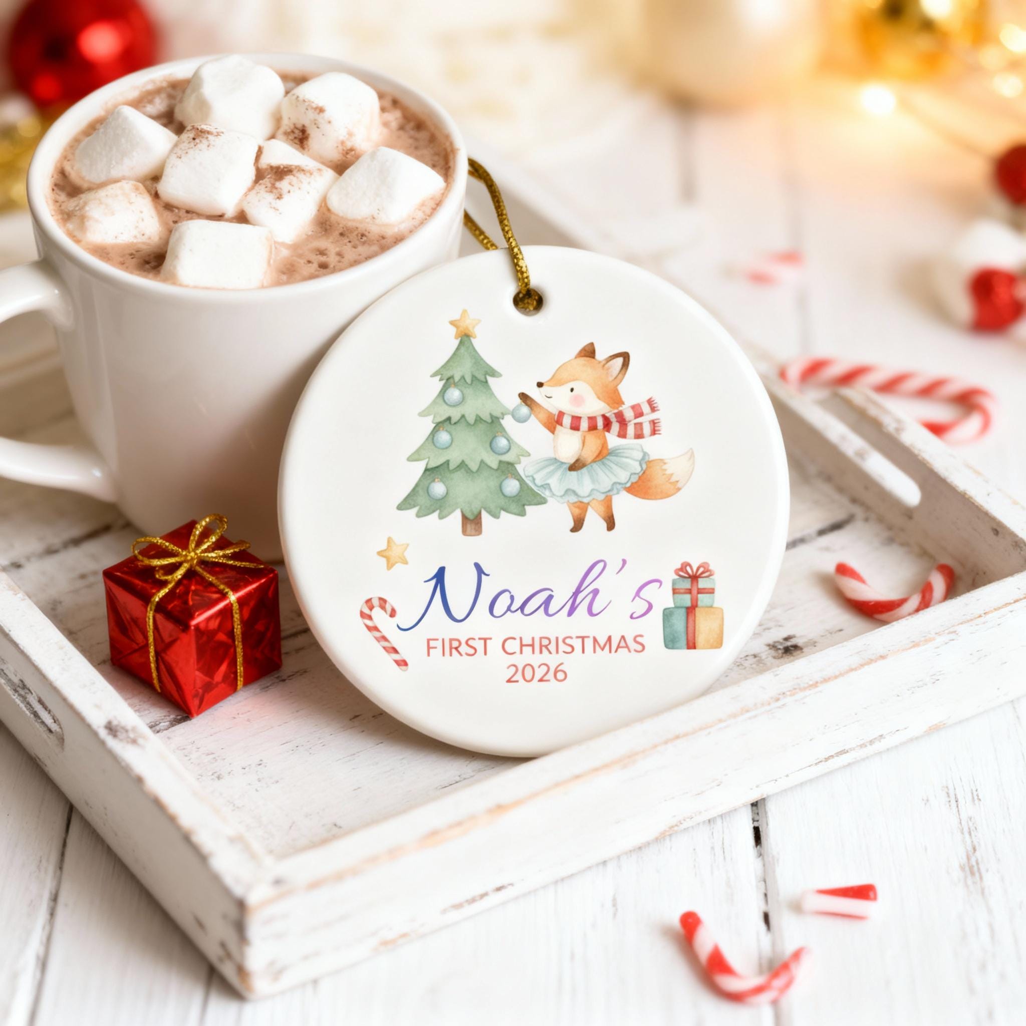 Personalized Baby's First Christmas Ornament, Fox Ceramic Bauble