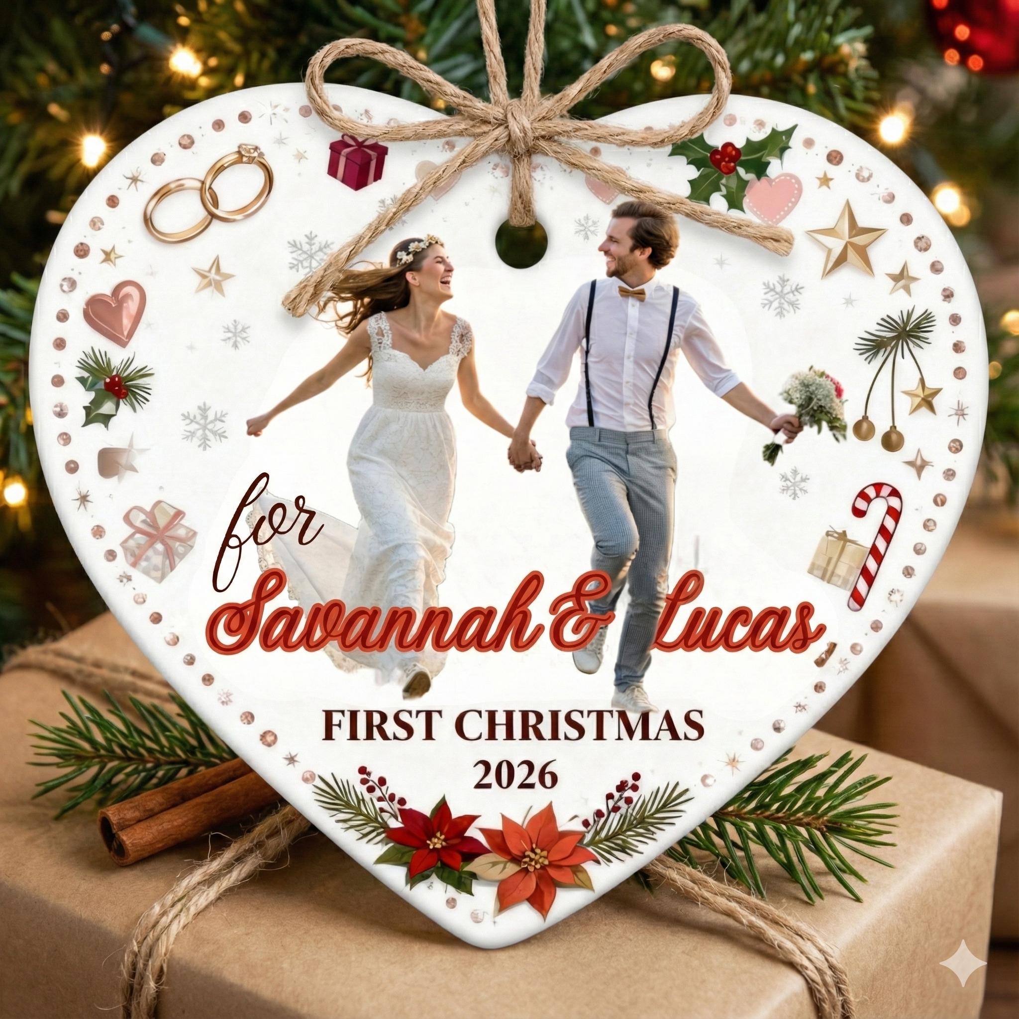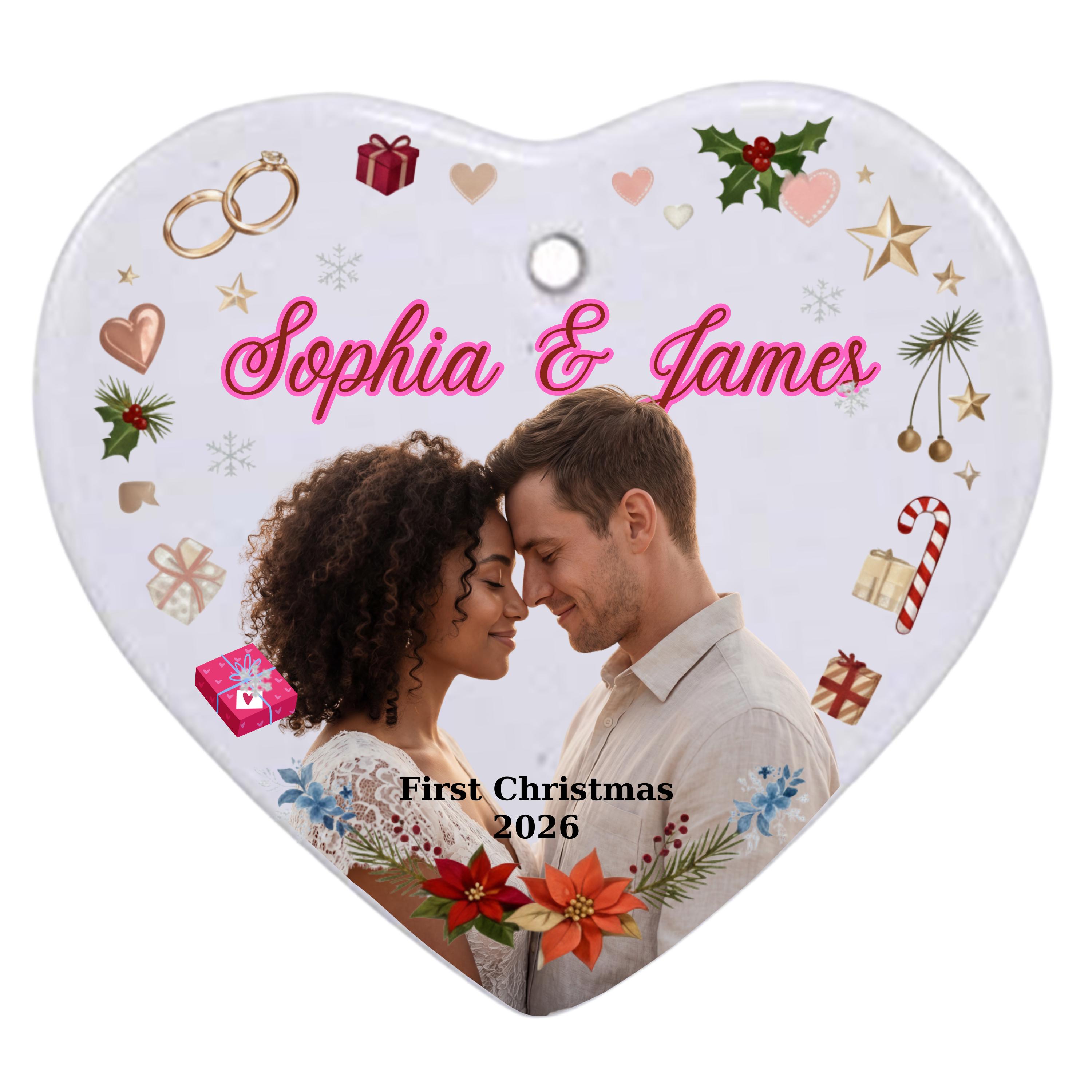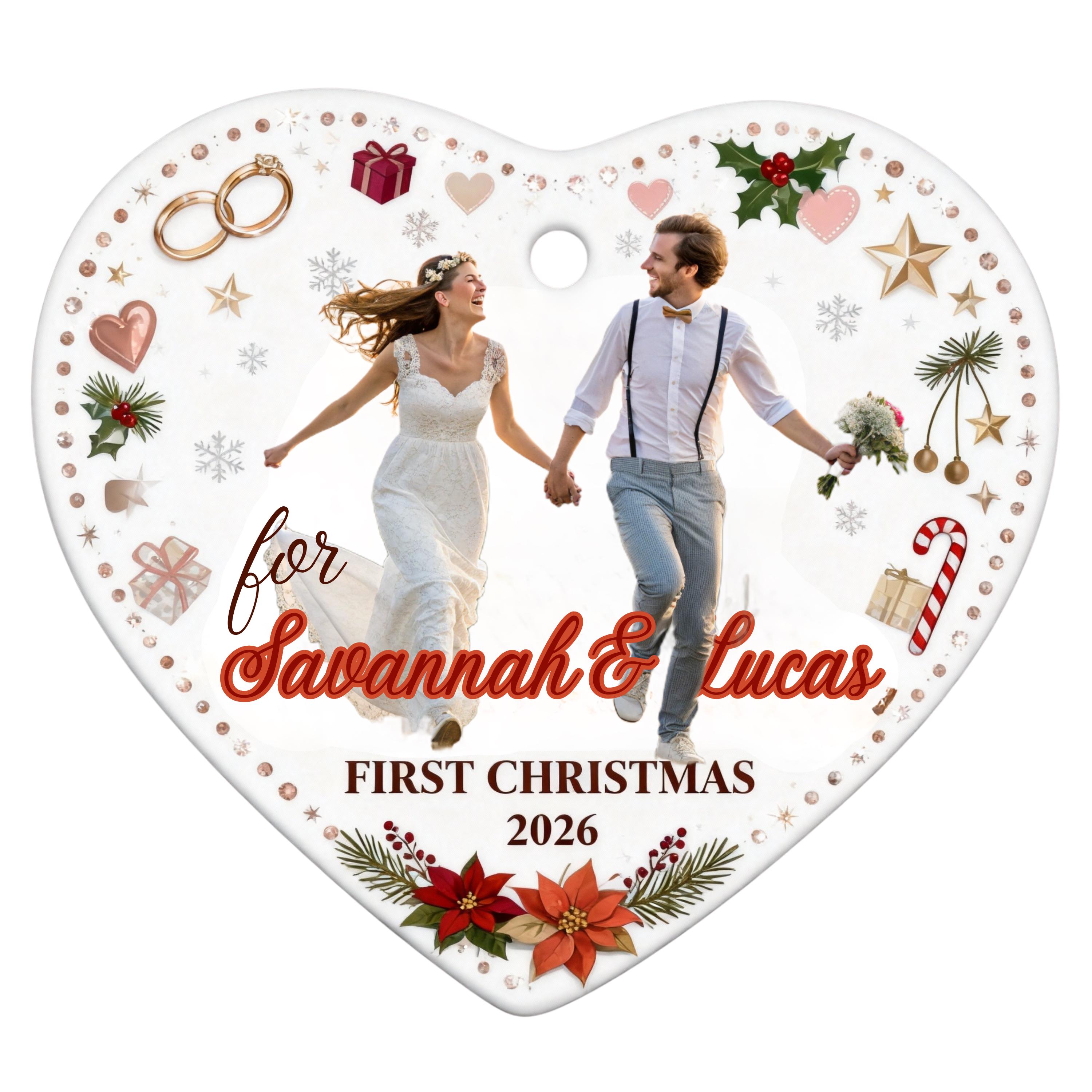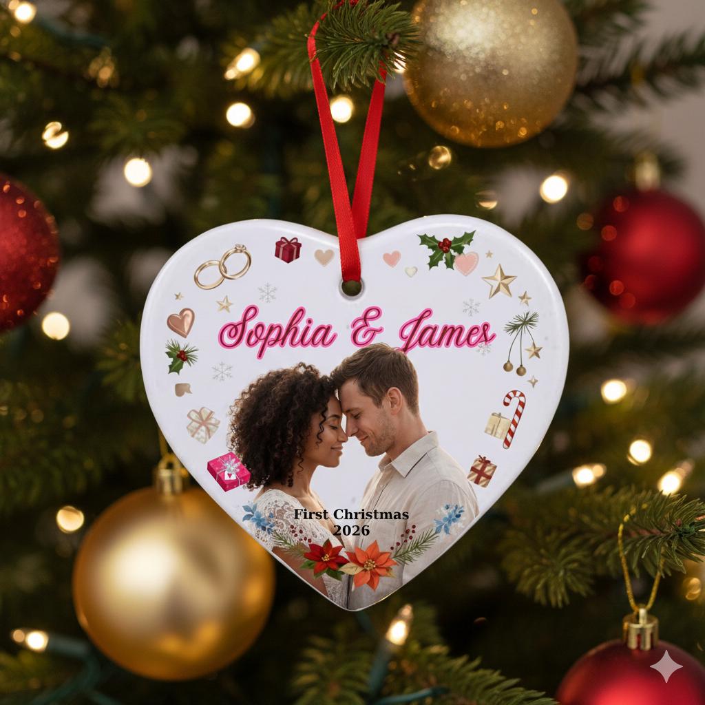 This elegant, heart-shaped, customizable ceramic ornament is designed to immortalize couples' special moments. Whether it's your "First Christmas Married," your wedding photo, or the first date, this ornament will take its place on your tree year after year as a symbol of your love.