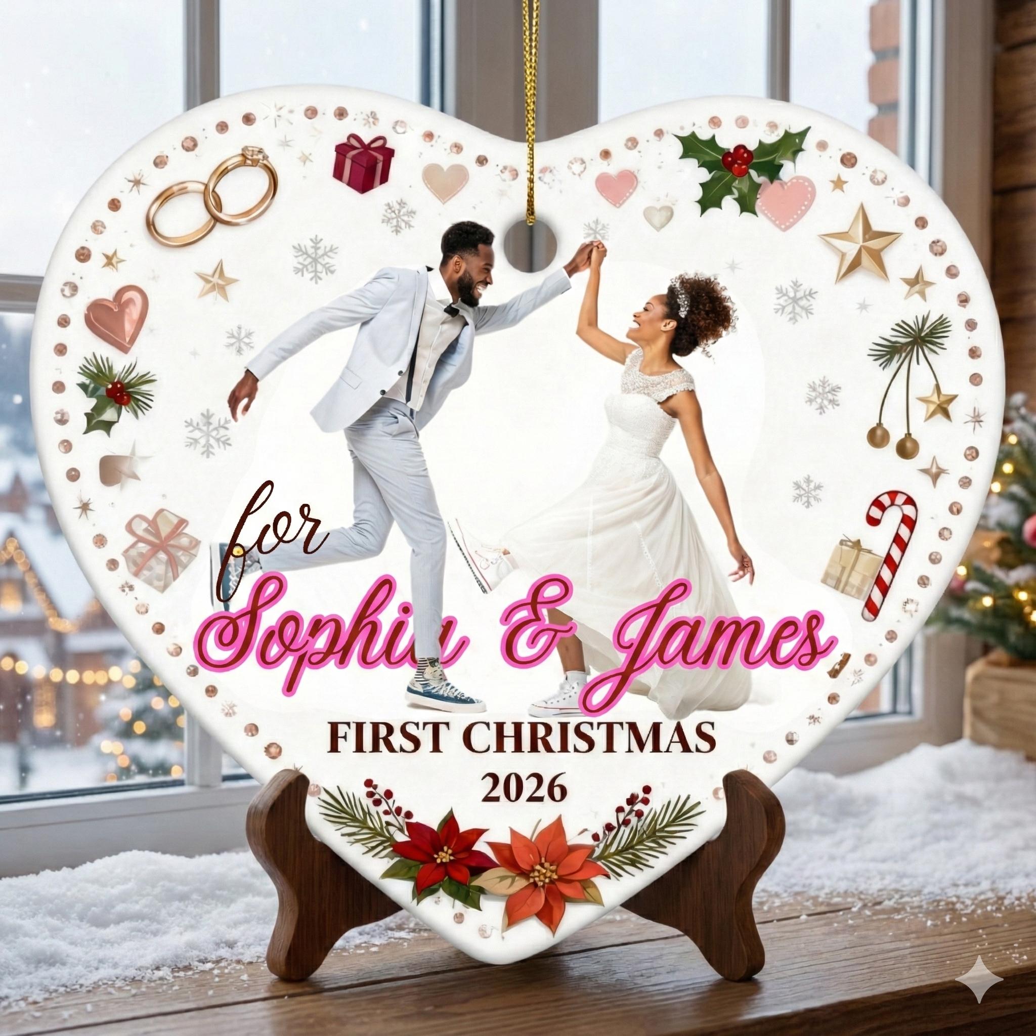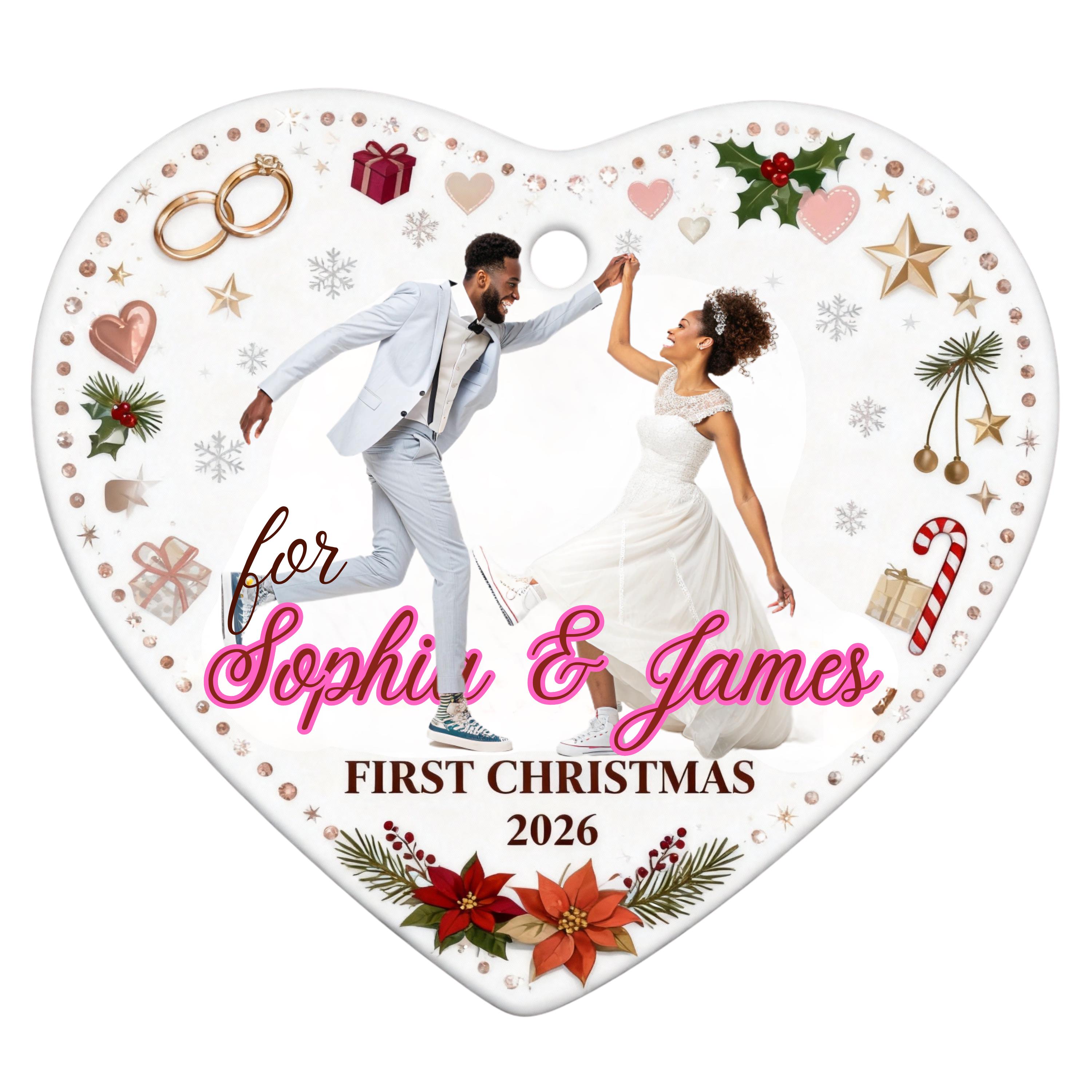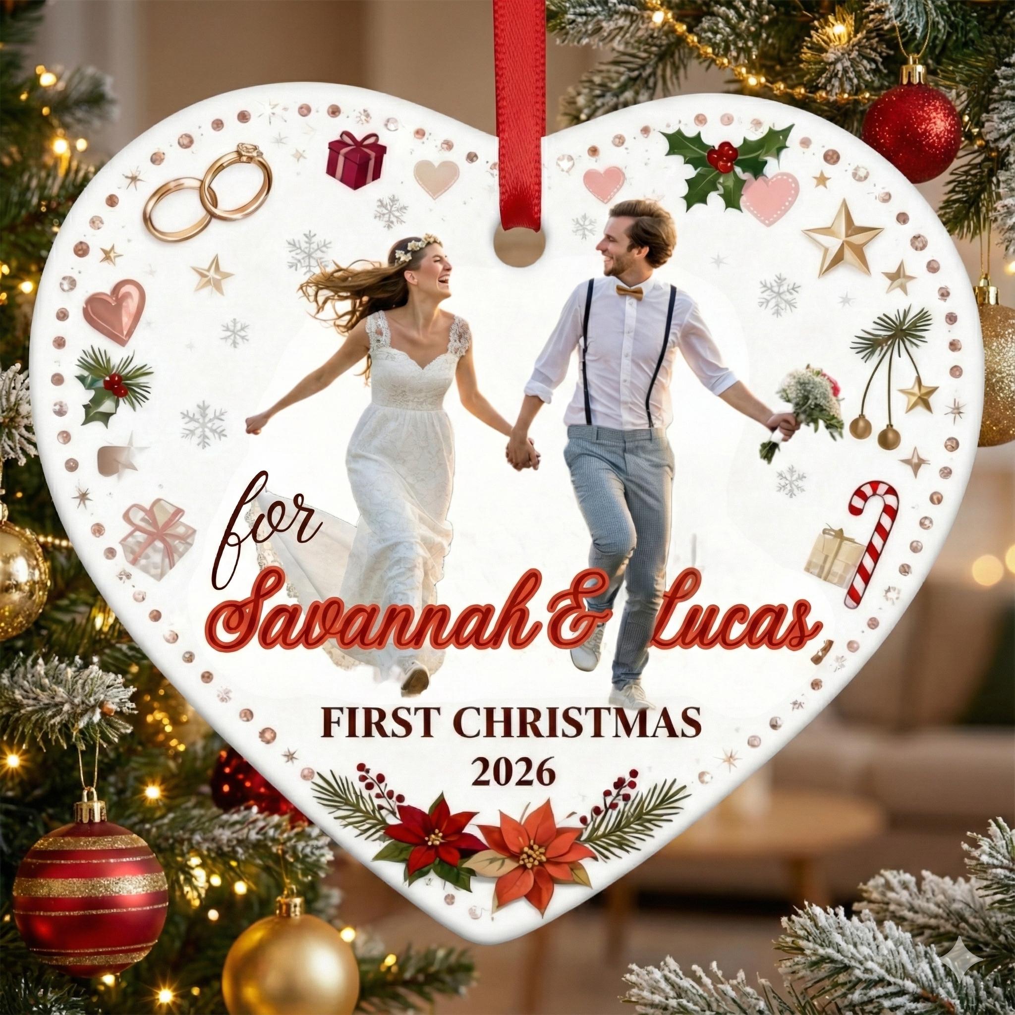 This elegant, heart-shaped, customizable ceramic ornament is designed to immortalize couples' special moments. Whether it's your "First Christmas Married," your wedding photo, or the first date, this ornament will take its place on your tree year after year as a symbol of your love.