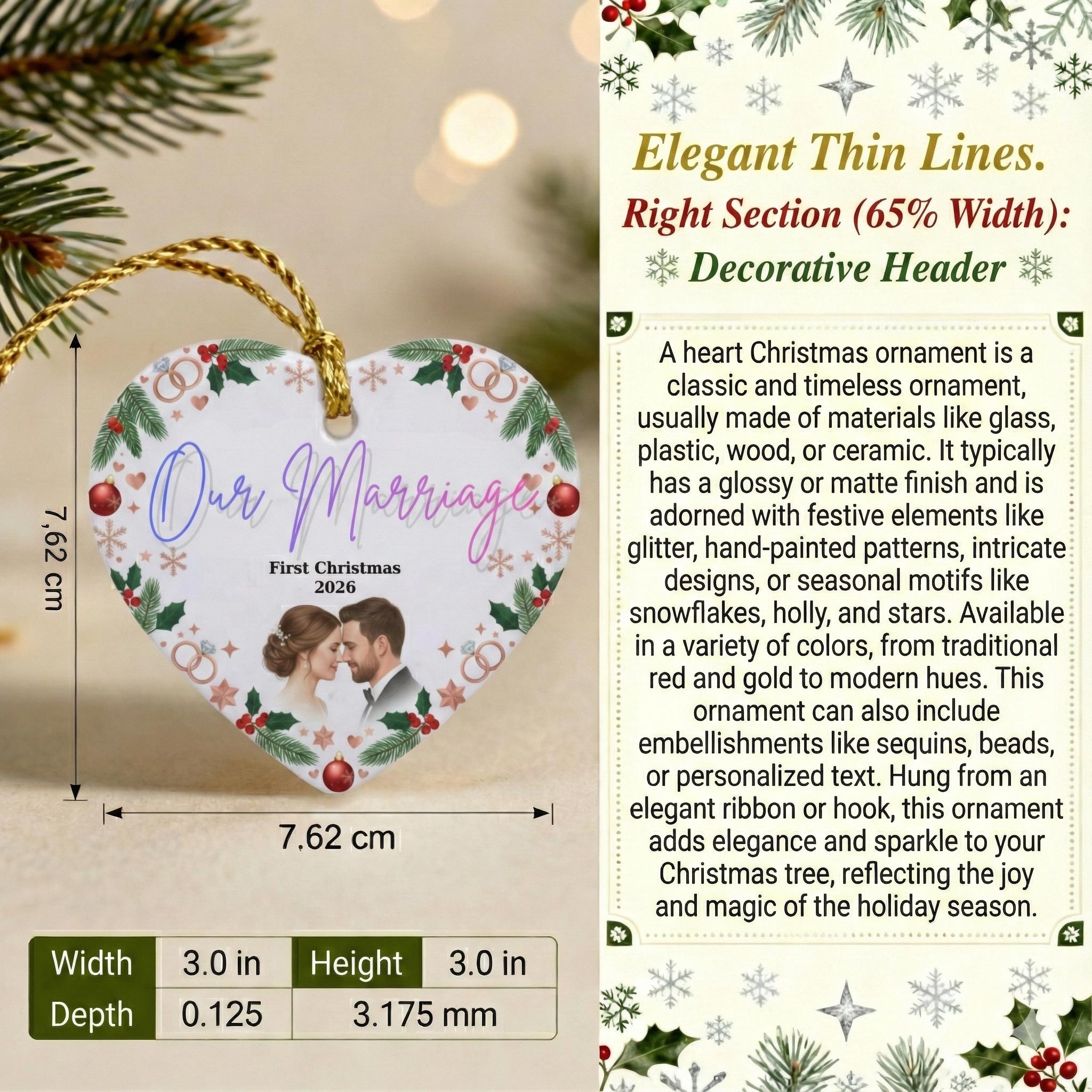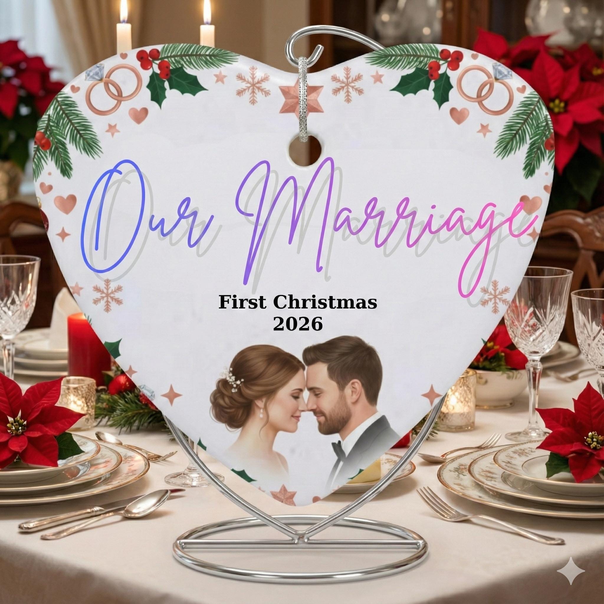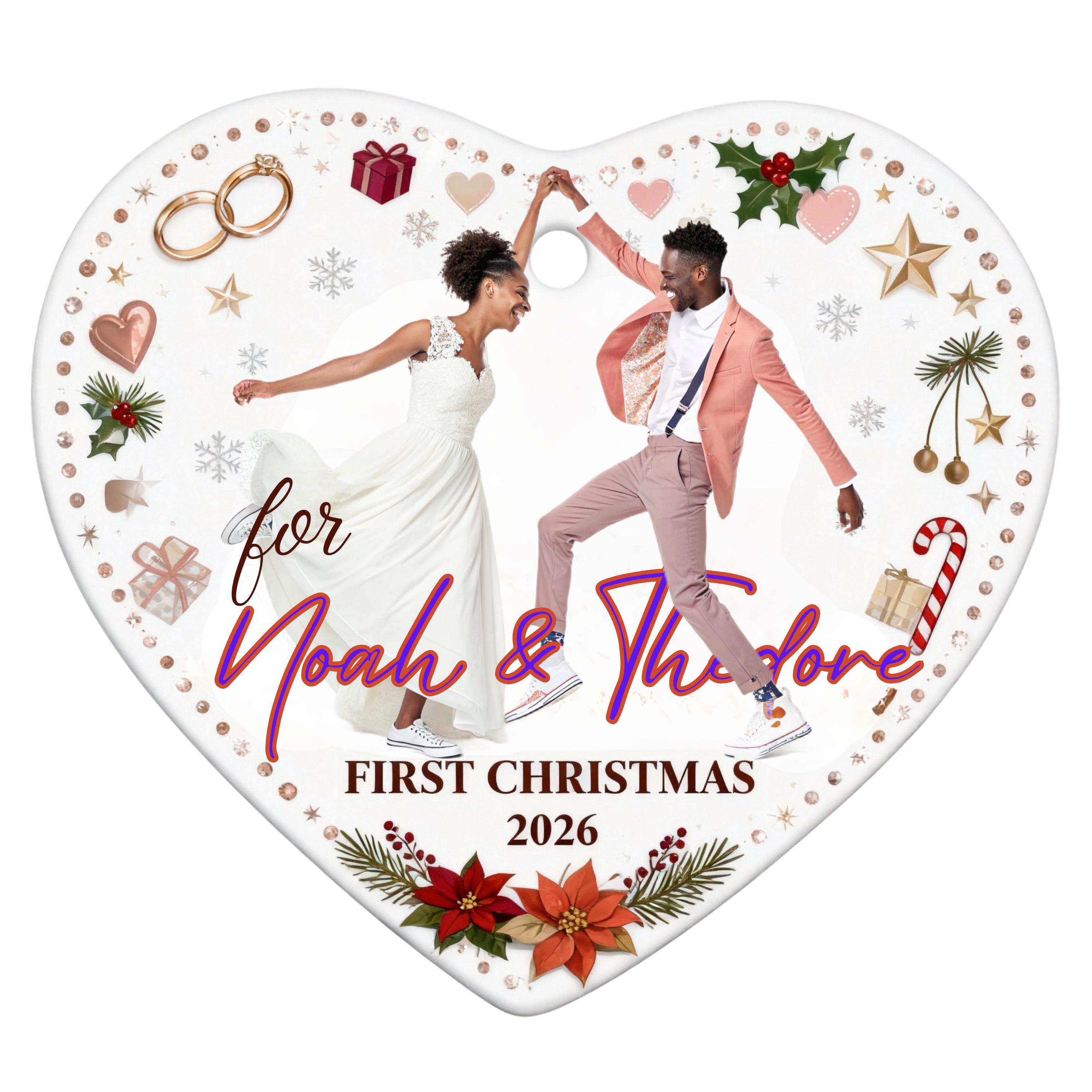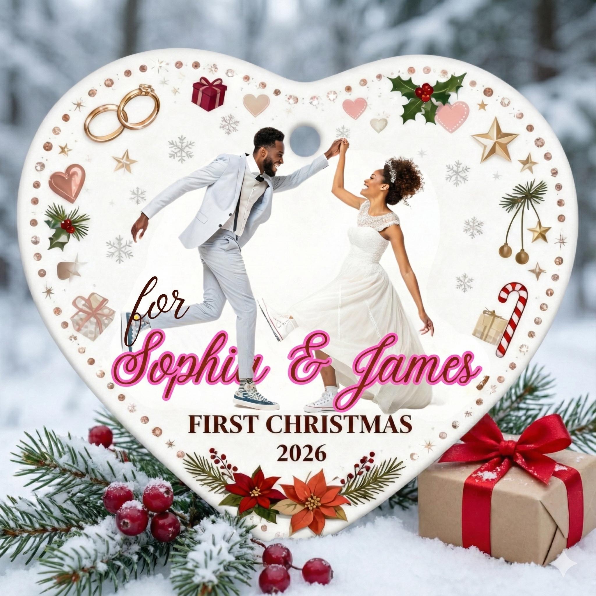 This elegant, heart-shaped, customizable ceramic ornament is designed to immortalize couples' special moments. Whether it's your "First Christmas Married," your wedding photo, or the first date, this ornament will take its place on your tree year after year as a symbol of your love.